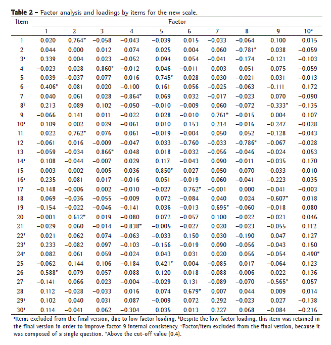 The composition of those ten factors and the loading values for each item are reported in Table 2. The application of 0.4 as the cut-off loading value for the inclusion of items into the factors led to the exclusion of 9 questions (numbers 3, 8, 10, 14, 16, 22, 23, 29, and 30). The initial composition of the factors and their respective items were as follows: Factor 1-items 6 and 26; Factor 2-items 1, 11, and 20; Factor 3-items 4 and 13; Factor 4-items 7 and 21; Factor 5-items 5, 15, and 25; Factor 6-items 17 and 28; Factor 7-items 9 and 19; Factor 8-items 2 and 12; Factor 9-items 18 and 27; and Factor 10-item 24.