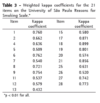 The scores on the 30 questions concerning smoking motivation were evaluated by exploratory factor analysis, using main component analysis and oblique rotation, aiming at the construct validation of the new scale.(15) The strategy used for factor extraction was principal axis factoring, because this method extracts most of the variance of the variables and has been traditionally used in order to reduce great amounts of data to smaller, concise sets of variables. The selection of the extracted factors was performed by applying the Kaiser criterion, which supposes that factors with eigenvalues < 1 should not be retained.(16) In addition, only the items with factor loadings > 0.4 were selected as components of the extracted factors. The internal consistency of the factors generated was assessed with Cronbach's alpha coefficient.(17) The test-retest reliability of the final version of the scale was evaluated using weighted kappa statistics and by determination of intraclass correlation coefficients (ICCs).(18,19)