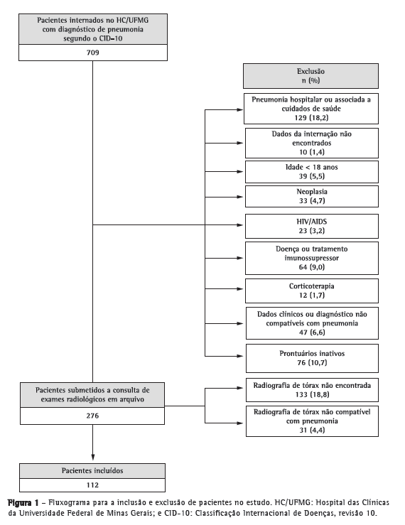 MétodosTrata-se de um estudo observacional, retrospectivo, realizado no HC/UFMG (hospital universitário com 501 leitos) em que foram incluídos pacientes internados na unidade de clínica médica, entre janeiro de 2005 e dezembro de 2007, com diagnóstico de PAC identificado conforme a Classificação Internacional de Doenças, revisão 10, utilizada na guia de internação (J-12 a J-18 e suas subdivisões). Os critérios de inclusão foram idade igual ou superior a 18 anos, início dos sintomas fora do ambiente hospitalar ou até 48 h após a internação, presença de infiltrado radiológico compatível com o diagnóstico de pneumonia e presença de pelo menos dois sinais e sintomas específicos (tosse, expectoração, dispneia, dor torácica, achados focais no exame físico do tórax, confusão, cefaleia, sudorese, calafrios, mialgia e temperatura ≥ 37,8°C). A avaliação radiológica foi feita por um médico radiologista do hospital sem o conhecimento dos dados clínicos.(6,10) Foram critérios de exclusão imunossupressão por AIDS; história de neoplasia nos últimos 6 meses, de doenças imunossupressoras, de tratamento imunossupressor (prednisona ≥ 10 mg/dia ou equivalente ou outros imunossupressores por período ≥ 3 meses) ou de fibrose cística; dados faltantes ou inconsistentes com o diagnóstico de PAC; exame radiológico não encontrado; e preenchimento de critérios para pneumonia adquirida no hospital ou associada a cuidados de saúde.(10)