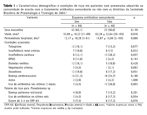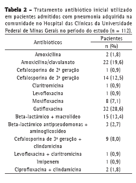 O tratamento antibiótico prescrito no primeiro atendimento foi classificado quanto a sua concordância com as recomendações das diretrizes brasileiras para o tratamento de PAC em pacientes imunocompetentes, de 2004, vigentes no período do estudo.(11) Foram considerados tratamentos concordantes com as diretrizes o uso de beta-lactâmicos (ceftriaxona, cefotaxima, amoxicilina, amoxicilina/clavulanato, ampicilina/sulbactam) em associação a um macrolídeo (azitromicina ou claritromicina) ou o uso de uma fluoroquinolona respiratória isolada (moxifloxacina ou levofloxacina). O uso de gatifloxacina foi considerado como tratamento adequado por encontrar-se disponível e por essa ter sido aprovada para o uso no período estudado. No caso de uso de antibióticos nos 3 meses anteriores à internação, os mesmos esquemas foram considerados, desde que ocorresse a mudança de classe terapêutica. A utilização de amoxicilina/clavulanato foi considerada adequada quando havia a hipótese de pneumonia aspirativa descrita em prontuário.