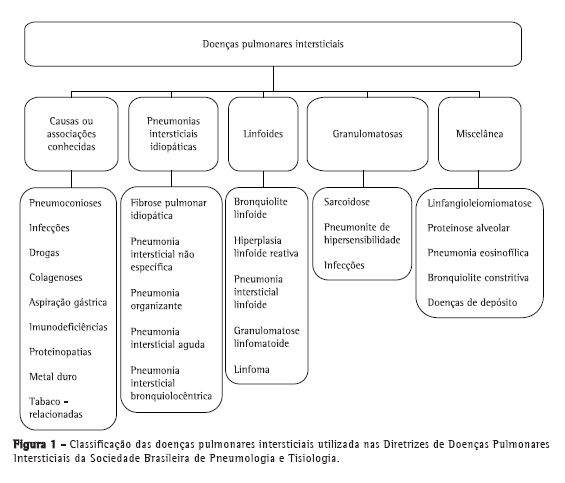 Uma classificação para as DPIs foi estabelecida para agrupar as doenças de acordo com critérios clínicos, radiológicos e histológicos; facilitar a comunicação entre os profissionais; facilitar a realização de registros epidemiológicos e de ensaios clínicos; e, principalmente, aperfeiçoar a abordagem dos pacientes. Na classificação descrita (Figura 1), alguns pontos merecem destaque: a inclusão das doenças tabaco-relacionadas, incluindo a fibrose associada ao tabaco e a fibrose associada ao enfisema(1-3); o acréscimo da pneumonia intersticial bronquiolocêntrica entre as pneumonias intersticiais idiopáticas(4,5); e a criação do grupo das doenças linfoides, caracterizadas por proliferação linfocitária.(6)