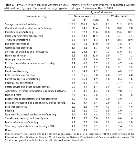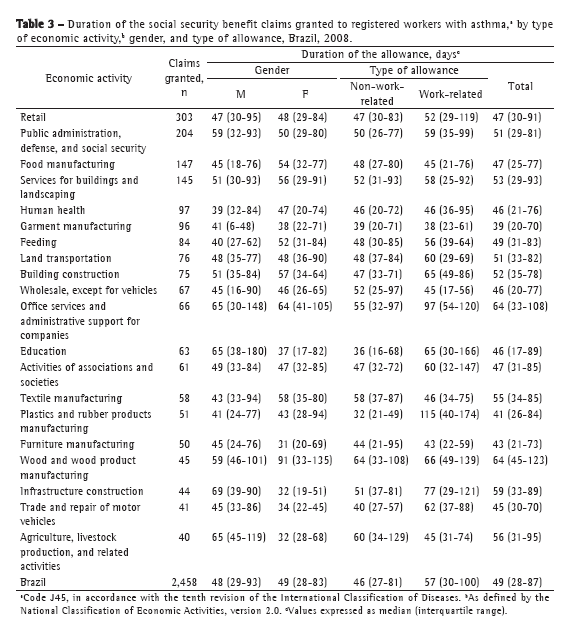 Objective: To determine the prevalence and duration of social security benefit (SSB) claims granted to registered workers with asthma in Brazil by the Brazilian National Institute of Social Security in 2008. Methods: This was a retrospective, descriptive study, based on information obtained from the Brazilian Unified Benefit System database, on the number of SSB claims granted to registered workers with asthma in 2008. The reference population was the monthly mean number of workers registered in the Brazilian Social Registry Database in 2008. The variables studied were type of economic activity, gender, age, and type/duration of the SSB allowance. The relationship between work and asthma was evaluated by the prevalence ratio (PR) between work-related and non-work-related SSB claims for asthma. Results: In 2008, 2,483 SSB claims were granted for asthma, with a prevalence of 7.5 claims per 100,000 registered workers. The prevalence was higher among females than among males (PR = 2.1 between the sexes). Workers  40 years of age were 2.5 times more likely to be granted an SSB allowance for asthma than were younger workers. The prevalence was highest among workers engaged in the following types of economic activity: sewage, wood and wood product manufacturing, and furniture manufacturing (78.8, 22.4, and 22.2 claims/100,000 registered workers, respectively). The median (interquartile range) duration of SSB claims for asthma was 49 (28-87) days. Conclusions: Asthma is a major cause of sick leave, and its etiology has a strong occupational component. This has a major impact on employers, employees, and the social security system. Being female, being  40 years of age, and working in the areas of sewage, wood and wood product manufacturing, and furniture manufacturing increase the chance of sick leave due to asthma.