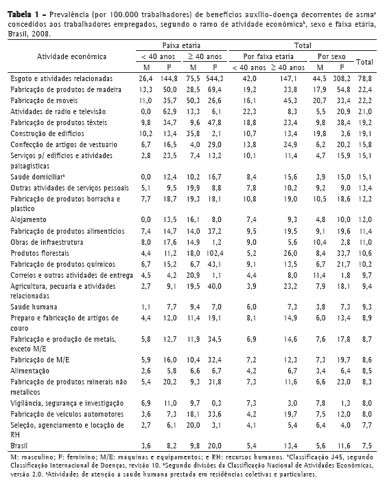 Objetivo: Determinar a prevalência e a duração dos benefícios auxílio-doença (BAD) decorrentes de asma concedidos pelo Instituto Nacional de Seguro Social aos empregados no Brasil em 2008. Métodos: Estudo descritivo e retrospectivo a partir do banco de dados do Sistema Único de Benefícios sobre os BAD decorrentes de asma concedidos em 2008. A população de referência consistiu da média mensal dos empregados registrados no Cadastro Nacional de Informações Sociais em 2008. Foram estudadas as variáveis ramo de atividade econômica, sexo, idade, tipo e duração dos BAD. A relação trabalho-doença foi avaliada por razão de prevalência (RP) entre BAD acidentários e previdenciários. Resultados: Em 2008, foram concedidos 2.483 BAD por asma, com prevalência de 7,5 BAD por 100.000 empregados. A prevalência foi maior em mulheres que em homens (RP = 2,1 entre os sexos). Empregados com  40 anos tinham 2,5 vezes maior probabilidade de receber BAD por asma do que aqueles com < 40 anos. Os ramos esgoto e atividades relacionadas, fabricação de produtos de madeira e fabricação de móveis tiveram as maiores prevalências (78,8; 22,4; e 22,2 BAD/100.000 empregados, respectivamente). A mediana (intervalo interquartílico) da duração dos BAD foi de 49 (28-87) dias. Conclusões: A asma é uma importante causa de afastamento do trabalho com forte componente ocupacional na sua etiologia, resultando em grande impacto para empregadores, empregados e previdência social. Ser mulher, ter  40 anos e trabalhar nos segmentos de esgoto, fabricação de produtos de madeira e de fabricação de móveis aumentam a probabilidade de afastamento do trabalho por asma.