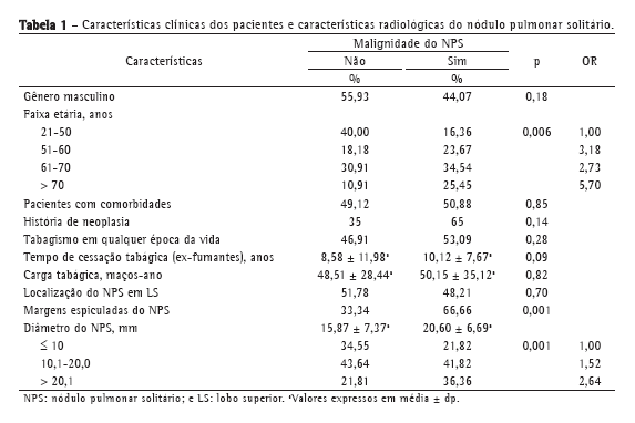Concluindo, dentre as características clínicas e radiográficas relacionadas ao NPS, três delas demonstraram significância estatística quando associadas à malignidade do NPS: idade mais avançada do paciente, presença de margens espiculadas do NPS na TC de tórax e diâmetro maior do NPS.
