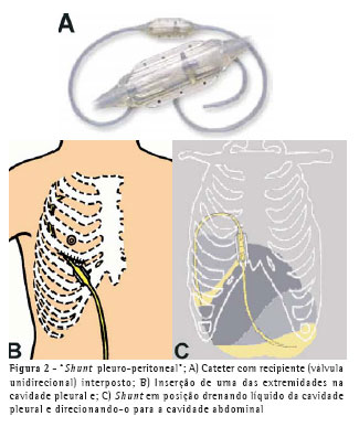 Em terceiro lugar deve-se considerar o shunt pleuroperitoneal, que nada mais é do que um cateter fino que tem, em seu meio, um recipiente (válvula unidirecional). As extremidades são posicionadas nas cavidades pleural e peritoneal e o cateter, incluindo o recipiente, segue por um trajeto subcutâneo (Figura 2). Quando o paciente apresenta piora clínica, basicamente dispnéia, comprime-se repetidas vezes o recipiente, retirando líquido da cavidade pleural e, graças à válvula unidirecional, enviando-o para a cavidade peritoneal. O inconveniente deste sistema reside no pequeno volume da câmara valvulada (+ 2 ml), o que obriga a uma exaustiva compressão deste compartimento: para a retirada de 400 ml de líquido pleural é necessário comprimir mais de 200 vezes. Ainda como aspectos negativos do sistema observam-se um elevado índice de obstrução da válvula, risco de implante neoplásico na cavidade abdominal(4) e o alto custo, que praticamente inviabiliza seu uso em nosso meio.