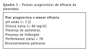 Identificado o momento ideal para a realização da pleurodese, devemos considerar outros fatores que, apesar de não serem consensuais, podem modificar os critérios de indicação, pois podem interferir no resultado pretendido. Assim, o pH ácido (< 7,3),(10) a glicose baixa (< 60 mg/dl) e a presença de quilotórax têm sido relacionados a pior prognóstico e a pior eficácia da pleurodese, independentemente da técnica e da droga utilizadas(5) (Quadro 3). A presença de linfangite e o índice de performance status inferior a 70 estão associados a pior evolução clínica do paciente após a indução da pleurodese.(5) Finalmente, o encarceramento pulmonar, seja pela presença de loculações pleurais seja pela não expansão pulmonar, determina menor eficácia da pleurodese, além de aumentar o risco de infecções do espaço pleural.(3) Por este motivo, nestas condições, a pleurodese não é indicada.(3)