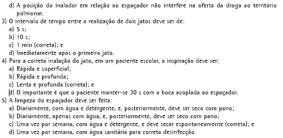 A terceira parte consistiu em perguntas fechadas com respostas diretas que versavam sobre: uso de espaçador, tipo de espaçador, tempo necessário entre dois jatos sucessivos do inalador dosimetrado, como deve ser feita a inspiração para a inalação, tempo que deve ser mantido em apnéia após a inalação, limpeza da cavidade oral após o uso (Anexo 1). Foram cinco questões, cada uma valendo 2 pontos, e a nota obtida também variava de 0 a 10.