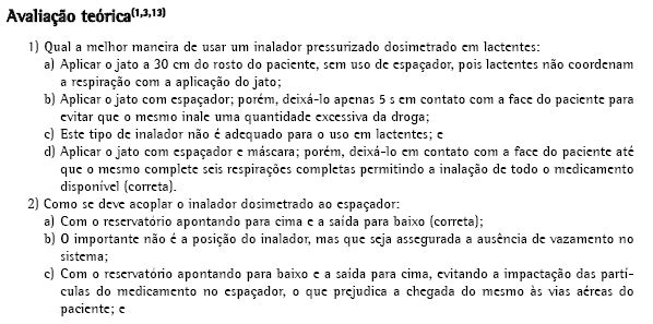 A técnica correta do uso dos inaladores dosimetrados em escolares, que devem usar o dispositivo em pé ou sentados, com as colunas torácica e cervical retificadas, consiste respectivamente na agitação do inalador, acoplamento deste ao espaçador com peça bucal, com o reservatório voltado para cima, realização de uma expiração tranqüila, colocação da peça bucal entre os lábios, disparo do dispositivo, com imediato início de uma inspiração lenta e profunda, pausa inspiratória de 10 s, repetição de todo o processo 30 s a 1 min após, se forem necessários dois ou mais jatos, e enxágüe da cavidade oral com água corrente. Para lactentes ou recémnascidos, que devem usar o dispositivo sentados ou em pé, se puderem fazê-lo, deve-se agitar o inalador, acoplá-lo ao espaçador com máscara, com o reservatório voltado para cima, colocar a máscara na face, cobrindo nariz e boca, evitando escape de ar, disparar o dispositivo, contar seis a dez respirações, sem interrupção, caso a criança chore, para que se evitem repetições indesejáveis da dose aplicada, repetir todo o processo 30 s a 1 min após, se forem necessários dois ou mais jatos, e enxágüe da cavidade oral com água corrente. Assim que a criança for capaz de colocar e manter a boca na peça bucal durante o procedimento, deve-se usar o espaçador com peça bucal ao invés do espaçador com máscara.