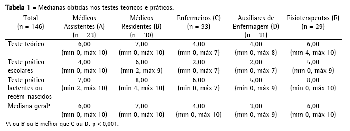 As medianas obtidas em cada tipo de teste estão apresentadas na Tabela 1. As melhores medianas, em valores absolutos, foram obtidas pelos médicos residentes, seguidos pelos fisioterapeutas, médicos assistentes, enfermeiros e auxiliares de enfermagem. prova prática de adolescentes e na prova teórica Comparando-se o desempenho geral das categorias, (p <0,001 e p <0,05, respectivamente, para ambas os médicos residentes, fisioterapeutas e médicos as categorias). Já entre a prova teórica e a prova assistentes obtiveram desempenho significativa-prática de adolescentes não houve diferença signimente melhor que os enfermeiros e auxiliares de ficativa (p >0,05 para ambas as categorias). Entre enfermagem (p <0,001 para as três categorias). os médicos assistentes, enfermeiros e auxiliares de Comparando-se médicos assistentes com resi-enfermagem, o desempenho na prova prática de dentes (p >0,05), residentes com fisioterapeutas lactentes foi significativamente melhor que o desem(p >0,05), fisioterapeutas com médicos assistentes penho na prova prática de adolescentes (p <0,001 (p >0,05), e enfermeiros com auxiliares de enfer-para as três categorias), e o desempenho na prova magem (p >0,05), não houve diferença significativa teórica foi significativamente melhor que na prova de desempenho. prática de adolescentes (p <0,05 para assistentes