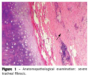Case report Case 1 A 38-year-old, white female patient, who was a nonsmoker, reported that she had been experiencing dry cough and 'wheezing', as well as tiring easily upon exertion, for two years, and that her condition had been progressively deteriorating in the preceding months. The patient was unsuccessfully treated for 'bronchitis' and subsequently sought treatment at a specialized clinic (university hospital). Her noisy breathing was noteworthy, and she underwent rigid bronchoscopy, which revealed laryngotracheal stenosis (40%). She underwent dilatation using a flexible dilator (Savary-Gilliard; Wilson-Cook Medical, Winston-Salem, NC, USA) and was treated with systemic corticosteroid therapy for two weeks. After remaining asymptomatic for seven months, the patient again presented the same symptoms. Bronchoscopy was performed and revealed stenosis located two centimeters below the vocal folds, which was the same location as the previous stenosis. The patient underwent a second dilatation (this time using a rigid bronchoscope) and biopsy, and was subsequently treated with corticosteroid therapy for another two weeks. Anatomopathological examination revealed severe fibrosis (Figure 1). When the patient returned to the outpatient clinic five months after the second dilatation, she reported experiencing dry cough and fatigue. Since she was in her third month of pregnancy, it was decided that she would be treated with corticosteroid therapy for two weeks, after which there was still no improvement. The patient was again submitted to bronchoscopy and dilatation, and the possibility of postpartum resection was discussed. When the patient returned to the outpatient clinic some time after having given birth, she reported recurrence of the symptoms. Corticosteroid therapy was then restarted, and surgery was recommended. Upon admission, the patient reported being asymptomatic, and no stenosis was seen in the broncoscopy performed as part of the preoperative evaluation. The patient was discharged and remained asymptomatic throughout the fifteen months of follow-up evaluation.