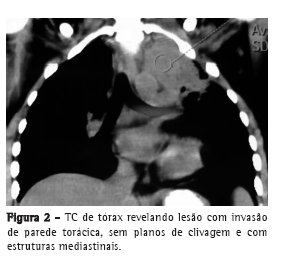 Foi encaminhada ao serviço de cirurgia torácica para investigação diagnóstica. A ressonância magnética mostrava uma lesão de contornos irregulares com captação de contraste, medindo aproximadamente 9,2 × 7,2 × 6,0 cm, ocupando a totalidade do lobo superior esquerdo, com invasão mediastinal e da parede torácica, e envolvendo a artéria carótida comum esquerda, a subclávia esquerda e parte do arco aórtico (Figura 1). Foi submetida à TC de tórax, a qual mostrou invasão das referidas estruturas e aderência da lesão aos corpos vertebrais, com invasão da fossa supraclavicular esquerda (Figuras 2 e 3).