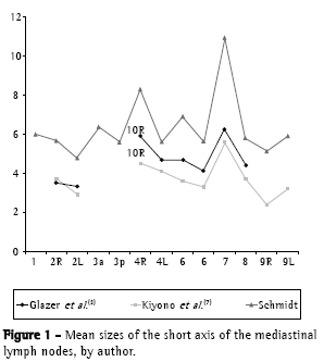 The lymph node sizes were greater than those found by other authors. Figure 1 shows the comparison of the mean sizes of the lymph node short axes observed in the present study and reported by other authors, considering the modifications of the descriptors on the maps of the lymph node stations.