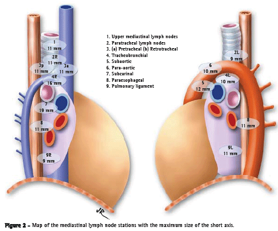In addition, the concept of lymph node enlargement is fundamental to the understanding of several diseases. Although there is controversy regarding the definition of an ideal value, various authors have adopted a maximum of 1 cm on the short axis to define normal lymph node size.(1-6) However, the patient samples evaluated in Brazilian studies of diseases with mediastinal lymph node involvement are not comparable in size to those evaluated in American, English, and Japanese studies.