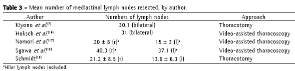 The definition of the size and number of mediastinal lymph nodes found after anatomical dissection has not been established. Studies on lymph node drainage still need to define the number of lymph nodes, which would serve as a reference to characterize the radicality of the resection.