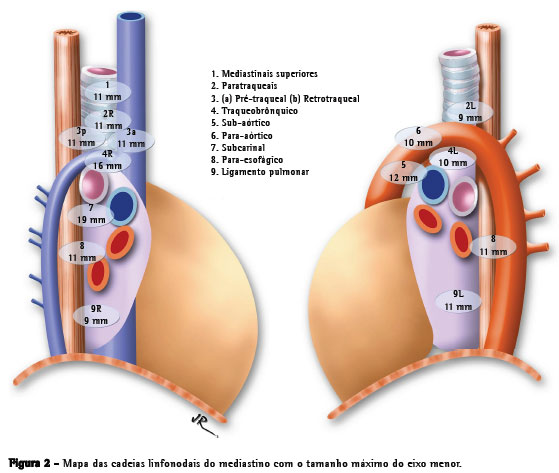 Um único estudo anatômico para determinação do tamanho e número dos linfonodos mediastinais foi realizado em 40 cadáveres de uma população de japoneses. Observou-se que os maiores linfonodos localizavam-se na cadeia subcarinal (cadeia 7), seguida pela cadeia traqueobrônquica 10R, equivalente à cadeia 4R pelo mapa da American Thoracic Society. O tamanho dos linfonodos mediastinais foi maior nos habitantes da zona urbana que nos da zona rural, sugerindo que fatores locais podem alterar essas características na população.(7)