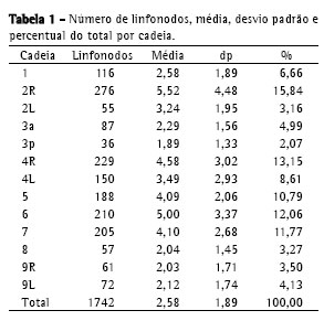 Através da análise de variância observou-se diferença significativa no tamanho dos linfonodos (p < 0,001). Por meio de um teste de comparações múltiplas, observou-se diferença significativa entre a cadeia 7 e as demais (p < 0,05). A cadeia 4R diferiu significativamente de quase todas as outras (p < 0,05), exceto das cadeias 3a, 3p e 5. As demais cadeias não diferiram entre si.