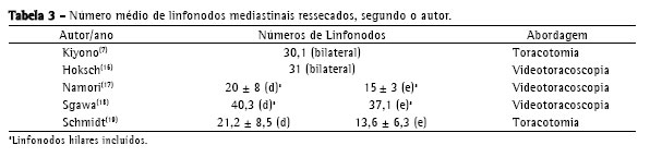 A definição do tamanho e número dos linfonodos do mediastino, encontrados por meio de dissecção anatômica, ainda não está estabelecida. Os estudos de esvaziamento linfonodal ainda carecem de uma definição do número de linfonodos, para servir de referência quanto ao aspecto de radicalidade da ressecção.