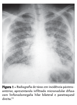Os exames radiográficos não são específicos para o diagnóstico dessa micose. Na histoplasmose pulmonar aguda, o aspecto radiográfico mais frequente é a presença de linfonodomegalias hilares bilaterais e mediastinais associadas a infiltrado reticulonodular peri-hilar bilateral (Figura 1). Porém, linfonodomegalia hilar unilateral, infiltrado intersticial reticulonodular difuso, cavidades e nódulos difusos ou isolados podem ser encontrados. Na histoplasmose pulmonar crônica, o aspecto radiográfico se assemelha ao da tuberculose do adulto ou de reinfecção, isto é, infiltrado progressivo em lobo superior, cavidades e sinais de fibrose. O alargamento do mediastino pode ser visto principalmente na TC de tórax nos casos de histoplasmose granulomatosa e fibrose mediastinal. Nódulo solitário ou nódulos múltiplos com calcificação central são muito característicos da forma nodular, isto é, do histoplasmoma.(1-5)
