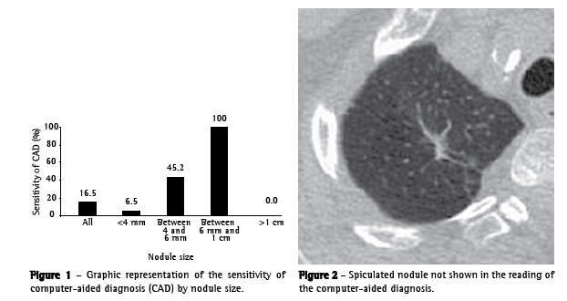 Another noteworthy finding is that the nodules indicated by the computer program were presented in apparently random order, without correlation with the sequence of slices, which slowed the process. In addition, the CAD often showed the same structure more than once in the same slice, or in subsequent slices, whether it was a true-positive or false-positive result. The numbers regarding sensitivity and insignificant impact on the reading by radiologists are not in accordance with those of other recent MDCT studies.(18,23-25) The discrepancies in the results obtained leave this and other recent studies open to some criticism.