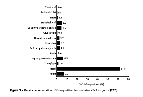 The mean number of false-positives per test (10.9), despite being within the range found in other studies (3-13 false-positives per CT scan of the chest),(21) is considerable, constituting a tiresome and time-consuming factor in the review of the data provided by the computer. The false-positives found were, principally, vascular structures, and are in accordance with those reported in the literature, except for the hilar structures (Figure 5), which are not often specifically cited.(9,19,22)