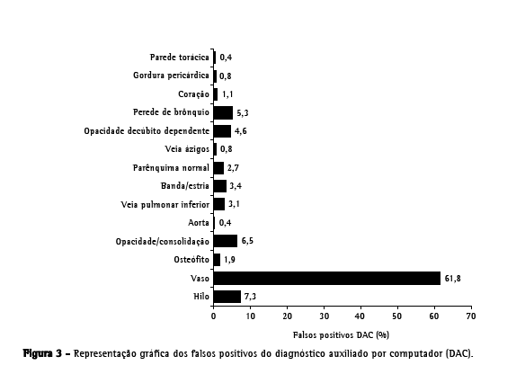 O número de falsos positivos por exame e por imagem (média de 322 imagens por exame) foi de 10,9 e 0,8 respectivamente; a razão falsos positivos/ verdadeiros positivos foi de 8,2:1. A maior parte dos falsos positivos foram vasos de pequeno e médio calibre (61,8%), estruturas do hilo (7,3%) e opacidades e consolidações (6,5%) (Figura 3).