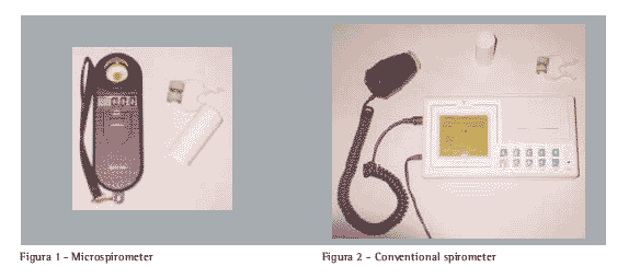 Microspirometers are among the most modern. However, according to Rodrigues(18), the accuracy of these portable spirometers needs to be determined. According to Ferguson(19), there have been few studies and there is little information on the amount of instruction needed in order to obtain acceptable levels of quality and on the degree of precision, exactitude, reliability, durability, frequency of calibration necessary and sensitivity of the devices.
