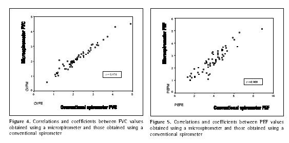 It is important to mention that no measurement or calculation is valid if the equipment used is not carefully calibrated. The devices used in the present study were inspected by reliable technicians prior to initiation of the measurements. The conventional spirometer was calibrated using a three-liter syringe, and the microspirometer was also tested prior to the verifications using expiratory maneuvers performed by a researcher.