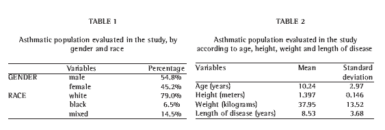 The study sample consisted of children and adolescents of both genders, clinically diagnosed with asthma and under treatment at the pulmonology clinic of the Hospital Materno-Infantil Presidente Vargas (HMIPV, President Vargas Hospital for Mothers and Children) in the city of Porto Alegre, in the state of Rio Grande do Sul (RS). Ages ranged from 5 to 16.