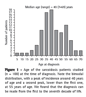Sarcoidosis is a disease with epidemiological characteristics that vary depending on the population studied. In the present study, we found that the patients under follow-up had characteristics similar to those reported in the literature, especially in terms of the most affected age group (61% of the patients were under 40 years of age at the onset of disease) and gender (56% were female).(16) It is interesting that the bimodal distribution of age at diagnosis that we found in our population, with a second peak of incidence at approximately 55 years of age, has been reported by other authors.(17-19)