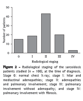 This descriptive, case-control study was approved by the Research Ethics Committee of the Universidade do Estado do Rio de Janeiro (UERJ, Rio de Janeiro State University) Pedro Ernesto University Hospital (Protocol no. 2302). The objectives of the study and the methods to be employed were explained in advance to the patients, who were then asked to give written informed consent. The study protocol was in accordance with Brazilian National Health Council Resolution 196/96. Between 2008 and 2010, 111 sarcoidosis patients were regularly treated at the Department of Pulmonology and Tuberculosis outpatient clinic for interstitial diseases, which belongs to the UERJ Faculdade de Ciências Médicas (FCM, School of Medical Sciences) and is located in the city of Rio de Janeiro. Of those 111 patients, 100 agreed to participate in the study. At this writing, all patients were still under outpatient follow-up. The sample size was calculated considering a confidence level (1 − α) of 95%, with a 9.39% confidence interval. Although the incidence of sarcoidosis in the Brazilian population has yet to be established, it is estimated to be lower than 10 cases/100,000 population,(13) and the number of cases of sarcoidosis in the state of Rio de Janeiro is estimated to be 1,200. Therefore, we considered that a minimum of 63 cases of sarcoidosis would be necessary for the study. Qualitative variables are expressed as percentages and as means or medians and standard errors.