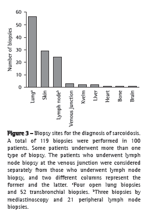 Most (56%) of the biopsies taken in order to confirm the diagnosis were lung biopsies, and most of those were performed by bronchoscopy, although thoracotomy was required in 4 cases. In 29 patients, the diagnosis was confirmed by biopsy of skin lesions. The diagnosis was confirmed by histopathological examination in 27 patients: of needle-biopsy samples of the peripheral lymph nodes in 21; of samples obtained through mediastinoscopy in 3; and of samples obtained through lymph node puncture at the venous junction in 3. The least common biopsy sites were the liver (in 2 patients), heart (in 1), and bones (in 1). Two patients underwent the Kveim-Siltzbach test. Some patients underwent biopsy of more than one site (Figure 3).