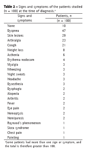 In terms of symptoms, 10 patients were asymptomatic at the time of diagnosis. The most common complaint was dyspnea (in 47 patients), followed by arthralgia (in 23) and dry cough (in 21). Arthritis was uncommon, occurring in only 2 patients who complained of arthralgia. Skin lesions were common (occurring in 29 patients), but, in most cases, they were disregarded by the patients.