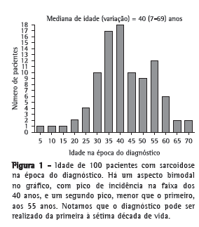 De uma forma geral, a doença afeta todos os grupos étnicos e todas as idades, sendo mais comum antes dos 50 anos e predominando em mulheres.(7) Na literatura, são descritas diferenças epidemiológicas, radiológicas, laboratoriais e de manifestações clínicas, assim como diferentes respostas terapêuticas nos diferentes grupos étnicos.(4,6-8) A maior prevalência de sarcoidose é encontrada na Suécia (121/100.000 habitantes),(9) enquanto a Espanha possui as taxas mais baixas da região.(10) Nos EUA, a taxa de incidência anual variou entre 10,9/100.000 habitantes e 35,5/100.000, sendo maior em negros.(4) De forma semelhante, na África do Sul, a prevalência da doença em negros é entre 10/100.000 habitantes e 20/100.000, mas essa é menor que 10/100.000 habitantes em brancos.(10) Em um estudo recente, observou-se que a incidência média anual em mulheres negras americanas era de 71/100.000 habitantes.(11) Nos países asiáticos, a doença é mais rara; a prevalência da doença no Japão é de 1-2 casos/100.000 habitantes.(12) Na América Latina, há poucos estudos a respeito da prevalência da enfermidade, e, no Brasil, a incidência é estimada em 10/100.000 habitantes.(13)