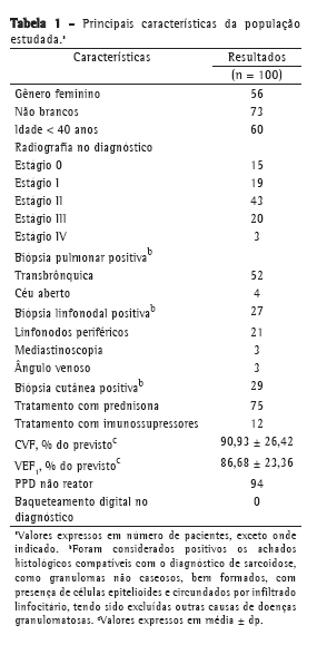 ResultadosForam analisados os dados de 100 pacientes com sarcoidose, todos com diagnóstico histopatológico confirmado e em acompanhamento no ambulatório de doenças intersticiais da Disciplina de Pneumologia e Tisiologia da FCM/UERJ entre 2008 e 2010. Os pacientes que apresentaram perda de seguimento ou não tinham todos os exames à disposição para serem revisados não foram incluídos no estudo. A Tabela 1 resume os principais achados observados nesses pacientes.