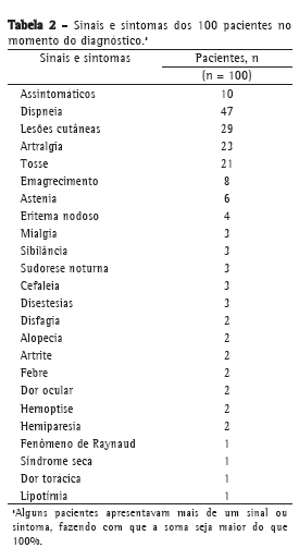 Apesar de o pulmão ser o principal sítio de acometimento (66%), verificamos um percentual alto de manifestações extrapulmonares (80%). Os sinais e sintomas dos pacientes no momento do diagnóstico são apresentados na Tabela 2. A sarcoidose linfonodal foi observada em 43 pacientes, e a de lesões cutâneas foi observada em 29.