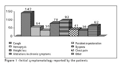 Cough is the most common symptom.(16,18) In this study, 54% of the patients reported cough as an initial manifestation of the disease.
