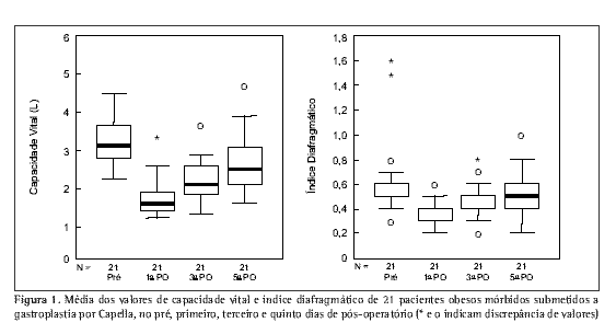 Method: 21 patients (3 of them men), with an average age of 39 ± 9.7 years and an average body mass index of 50.4 kg/m2, all candidates for gastroplasty, were evaluated during the preoperative period and again on the first, third and fifth postoperative days. Tidal volume, vital capacity, minute volume, maximal expiratory pressure and maximal inspiratory pressure, as well as chest and waist circumferences, were measured. Postoperative pulmonary complications and mortality were assessed.