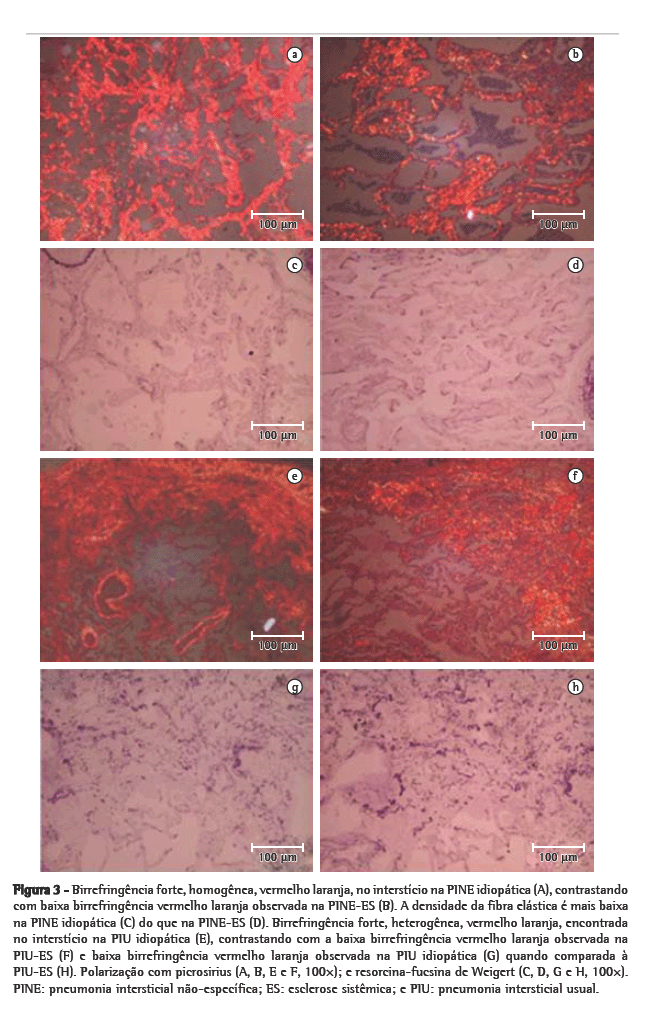 A quantificação de fibras de colágeno/elásticas nas paredes intersticiais foi realizada através de uma sistema de análise de imagem. O sistema consiste de uma câmera Olympus, acoplada a um microscópio Olympus (Olympus Optical, Tóquio, Japão), que transmite as imagens a um monitor de computador. Para processar as imagens, foi usado um sistema digitalizador (Oculus TCX; Coreco Inc, St. Laurent, Quebec, Canadá) em conjunto com o software ImagePro Plus 6.0 (Media Cybernetics, Silver Spring, MD, EUA). Quantificamos 10 campos por biópsia em casos de PINE, ao passo que quantificamos 30 campos por biópsia em casos de PIU: 10 em áreas normais; 10 em áreas intermediárias (colapso alveolar); e 10 em áreas de remodelamento (fibrose mural e áreas de faveolamento).(19,20) Os limiares para fibras dos sistemas colagenoso e elástico foram estabelecidos para cada lâmina, após aumentar o contraste até o ponto em que as fibras fossem facilmente identificadas como bandas negras (elásticas) ou birrefringentes (colágeno). A área ocupada pelas fibras foi determinada através de reconhecimento densitométrico digital, ajustando-se o nível do limiar de medida até a densidade cinza das fibras dos sistemas colagenoso e elástico. Os brônquios e os vasos sanguíneos foram cuidadosamente evitados durante as medições.