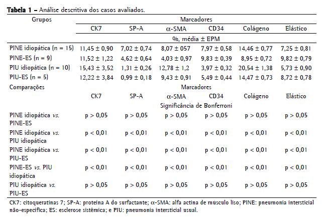 As células epiteliais positivas (CK7 e SP-A), as células endoteliais (CD34) e os miofibroblastos (α-SMA) foram analisados sem análise de imagem, já que o o método usando apenas a ocular é mais específico para quantificar as estruturas e formas que apresentariam densidades semelhantes à análise da imagem. Resumidamente, usamos uma ocular de 400× contendo um retículo com 100 pontos e 50 linhas para a contagem sistemática da fração de linhas recobrindo estruturas positivamente coradas.(17) No padrão histológico da PIU, a heterogeneidade temporal e as áreas alternadas de remodelamento representaram três áreas diferentes na mesma biópsia. Como habitualmente, quantificamos 10 campos por biópsia quando a distribuição das lesões era homogênea, como no padrão histológico da PINE, ao passo que quantificamos 30 campos por biópsia nos casos de PIU: 10 em áreas normais; 10 em áreas intermediárias (colapso alveolar); e 10 em áreas de remodelamento (fibrose mural e áreas de faveolamento). Calculamos a média dos campos microscópicos para obter a porcentagem final de estruturas coradas.