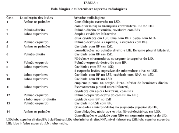 Results: The charts of 14 patients were selected. All had presented hemoptysis, followed by productive cough, dyspnea, weight loss, fever, asthenia and chest pain. In one patient colonized by Aspergillus niger and in another colonized by Scedosporium apiospermum (Teleomorph, Pseudallescheria boydii), active tuberculosis was seen concomitant to the fungus ball. In the remaining cases, the mycobacteria were found in the adjacent parenchyma or in the contralateral lung.