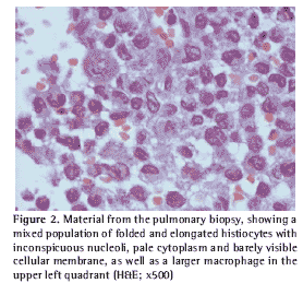 An open lung biopsy was performed, the macroscopic exam of which revealed multiple nodules interspersed with normal tissue. The histological assessment showed many peribronchial granulomas composed of histiocytes, lymphocytes and eosinophils. The histiocytic infiltration also affected the septal fibrous tissue. The histiocytes presented elongated, irregular and folded nuclei, with delicate nuclear membranes and inconspicuous nucleoli. The cytoplasm was abundant and eosinophilic (Figure 2). The histiocytes stained positive for S100 protein.