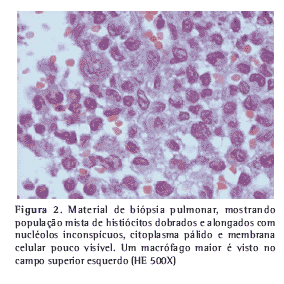 Foi realizada biópsia pulmonar a céu aberto, cujo exame macroscópico revelou múltiplos nódulos intercalados com tecido normal. A avaliação histológica demonstrou muitos granulomas peribronquiolares compostos de histiócitos, linfócitos e eosinófilos. A infiltração histiocitária também envolvia o tecido fibroso septal. Os histiócitos apresentavam núcleos alongados, irregulares e dobrados, com membrana nuclear delicada e nucléolos inconspícuos. O citoplasma era abundante e eosinofílico (Figura 2). Os histiócitos coravam-se positivamente pela proteína S100.