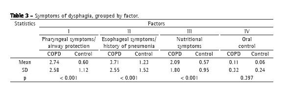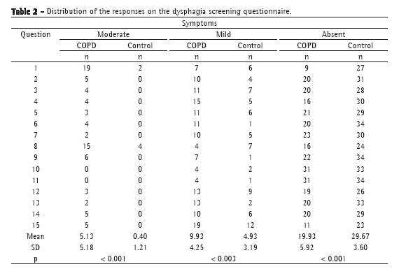 Table 2 shows a comparison between the two groups in terms of the symptoms of dysphagia. In the study group, the number of individuals who gave a response that was equivalent to "moderate symptom of dysphagia" was greater for question 1 than for any other question, as well as being greater, for question 1 alone, than the number of control group individuals who gave an equivalent response. Question 1 refers to a history of pneumonia, and the response can be influenced by the high frequency of respiratory infections in individuals with COPD. Because the response to question 1 could interfere with the results, we performed two statistical analyses of the questionnaire. In one of the analysis, question 1 was included, whereas in the other, it was not. The two statistical analyses yielded similar results. Therefore, we decided to maintain question 1 in the questionnaire.