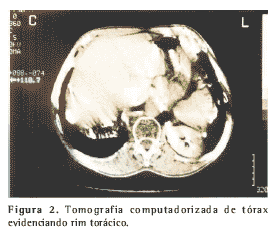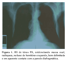 Relatava como fator de melhora o repouso, e o etilismo como fator de piora. O paciente não relatava trauma ou qualquer queixa anterior de moléstias respiratórias ou urinárias. Apresentava-se hidratado, normocorado, acianótico, anictérico, eupneico e afebril. Ao exame físico do tórax, apresentava aumento do diâmetro ântero-posterior (tórax em barril), diminuição da expansibilidade e som timpânico em ambas as bases pulmonares, caracterizando quadro clínico de enfisema pulmonar. Foram solicitados radiogramas de tórax em posição póstero-anterior e perfil, em que se evidenciou uma massa oval, radiopaca, na base do hemitórax esquerdo, bem delimitada e em aparente contato com a parede diafragmática (Figura 1). Posteriormente, foi solicitada tomografia computadorizada de tórax, na qual se evidenciou uma área ovalada, hiperdensa, na base do hemitórax esquerdo, que foi diagnosticada como ectopia renal (Figura 2).