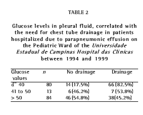 The Hospital das Clínicas of the Universidade Estadual de Campinas (State University at Campinas) is a tertiary-care hospital. In an attempt to reduce the morbidity and mortality related to parapneumonic effusion, as well as to reduce both hospital stay and complications related to this disease, the staff of the Pediatrics Department, together with the pediatric surgery team, devised a scoring system based on clinical, radiologic and laboratory data in the literature. The objective of this study was to evaluate the effectiveness of this scoring system and of the variables used in the literature as indicators of the need for pleural drainage in pediatric patients with parapneumonic effusion.