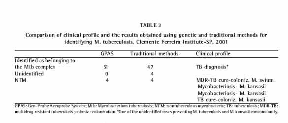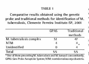 reading was positive for the M. tuberculosis complex in 51 of the samples (one of them associated with M. kansasii) and 4 classified as fitting the profile of NTM, being identified by specific probes (3 cases of M. kansasii and one case of M. avium). Using traditional methods, 47 samples were identified as belonging to the M. tuberculosis complex, 4 were classified as fitting the profile of NTM (in agreement with the genetic probe results), and 4 were unidentified, one of which being exactly the one that presented two mycobacterium species in the probe reading (Table 1).