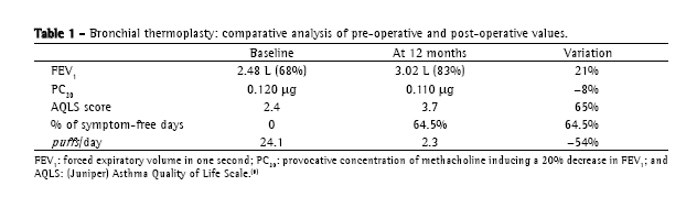 A significant functional improvement was observed in the FEV1 of the patient. However, no reduction in bronchial hyperresponsiveness was observed at 12 months after the treatment, different from what has been observed in previous studies.(5) Significant clinical improvement was observed: there was a reduction in the quantity of relief medication used; the quality of life questionnaire score increased, although the increase (of 1.3 points) was less than that considered clinically significant (2 points); and of the patient reported more symptom-free days. In preliminary studies, increased peak expiratory flows (morning and evening), as well as a reduction in the use of relief medication, have also been observed,(5) as have improvements in quality of life indexes.(6) Various consensuses recommend the use of standardized quality of life questionnaires,(1,7) together with tools that measure overall clinical improvement of the asthma patient, in order to better establish the effectiveness of a new treatment. In any evaluation of the quality of a new treatment employed in asthma patients, this information is as important as the functional improvement. In this case, the clinical improvement was evinced by the greater number of symptom-free days, the decrease in the use of relief medications, and the improvement in the AQLS questionnaire score.