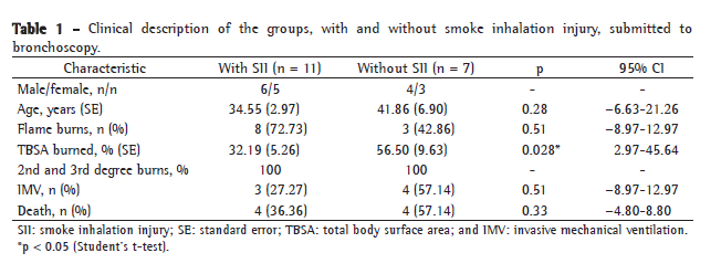 Our analysis of the results found in the 18 patients submitted to bronchoscopy revealed that TBSA burned and age are significant contributing factors to the increase in mortality, which is in accordance with the great majority of the studies found in the literature. In our study, the presence of SII in isolation did not contribute to the increase in mortality, and it is not a good predictive factor, as has also been observed by other authors.(25,26) There was also no relationship between TBSA burned and the presence of SII, since the patients with the highest mean TBSA burned presented no endoscopic findings indicative of SII.