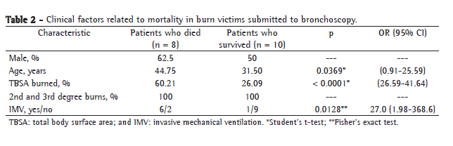 Of the 18 patients submitted to bronchoscopy, 7 (38.9%) were intubated and submitted to invasive mechanical ventilation. During the study period, 8 (44.4%) of the 18 patients died. Fatal outcomes were strongly related to three of the factors studied: percentage of TBSA burned; age; and development of acute respiratory failure, characterized by the institution of invasive mechanical ventilation. Gender had no influence on patient mortality.