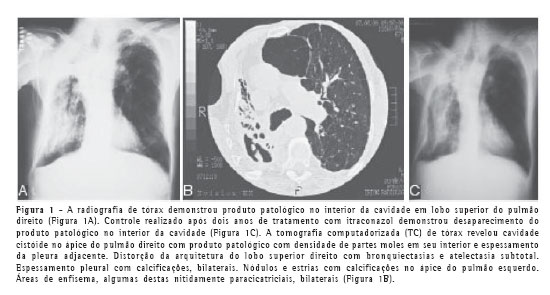 Tratamento e evolução: foi iniciado tratamento com itraconazol (200 mg/dia); o paciente recu-perou o peso inicial e manteve o tratamento por 18 meses; apresentou importante melhora clínica e o antifúngico foi suspenso.